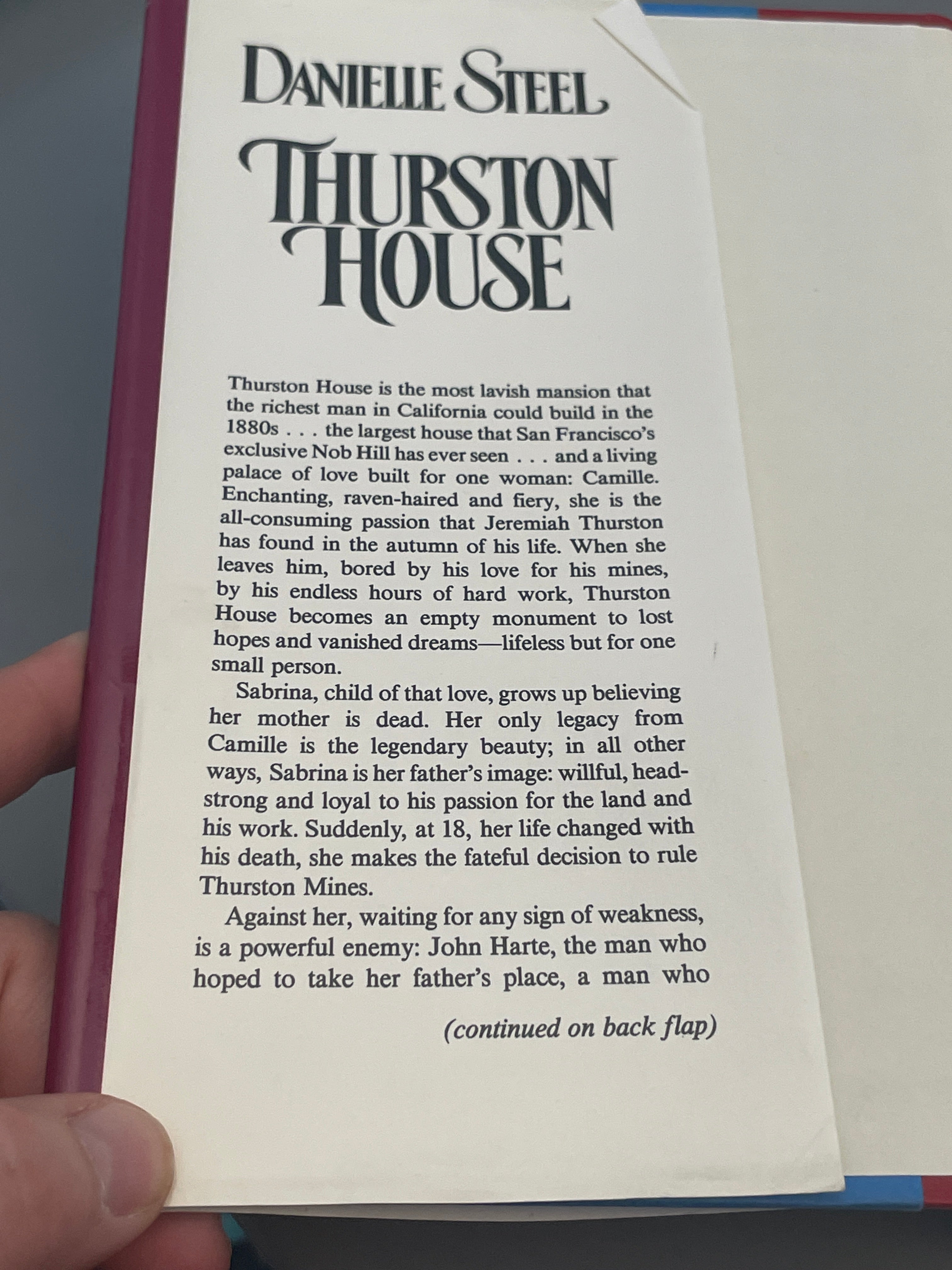 Jeremiah Thurston built Thurston House, San Francisco's grandest mansion. When he found himself alone with his infant daughter, Sabrina, he was determined to bring her up to run the biggest mining business in California. Nothing would stop her from taking over his dynasty -- not the San Francisco earthquake, the deadly schemes of a cunning rival, the Great depression, or her own needs and determination as she carries on the traditions established by her father.