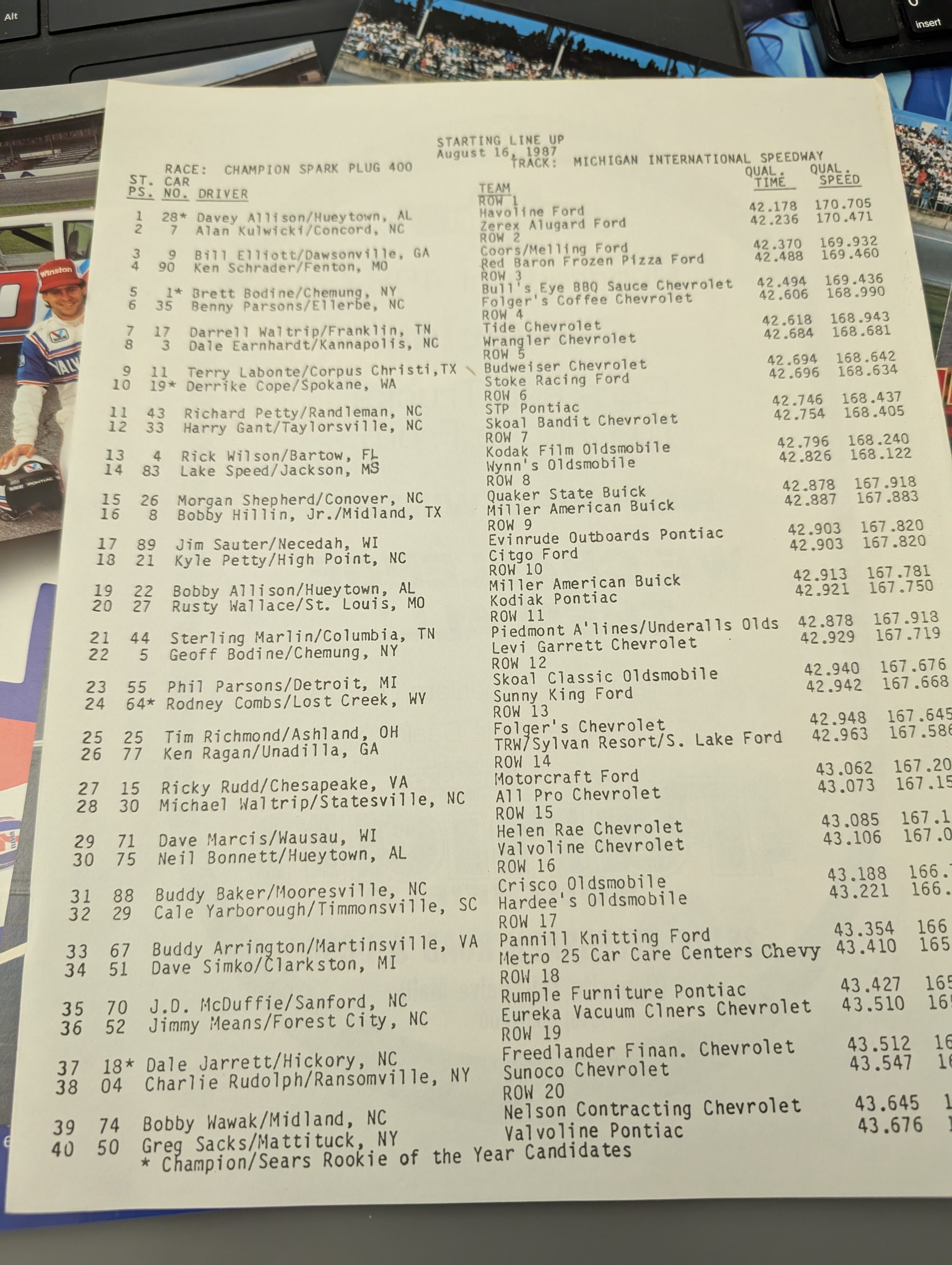*1987 NASCAR Michigan Champion Spark Plug 400 Program/L-Up, Bill Elliott Win #20*