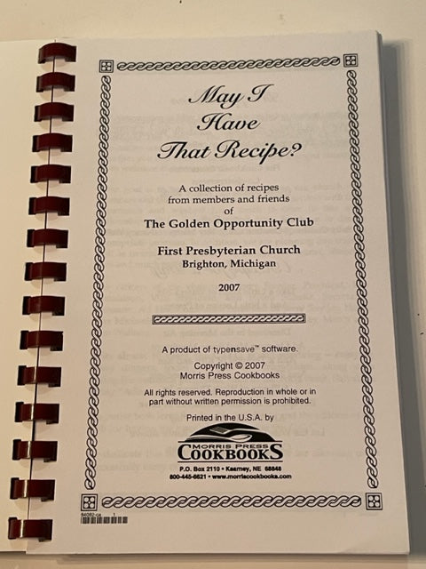 May I Have that Recipe? Morris Press (First Presbyterian Church, Brighton MI) is backordered and will ship as soon as it is back in stock.