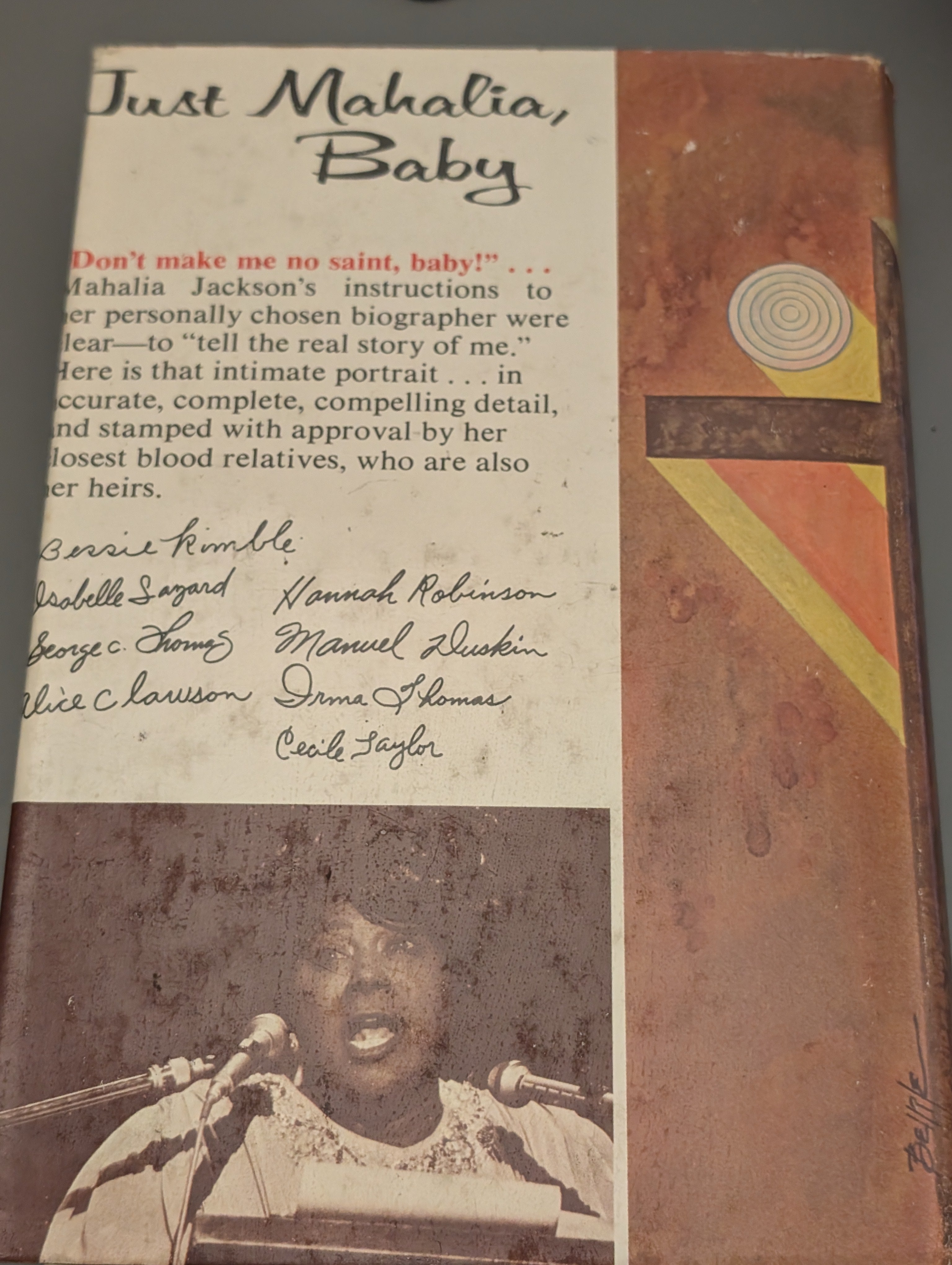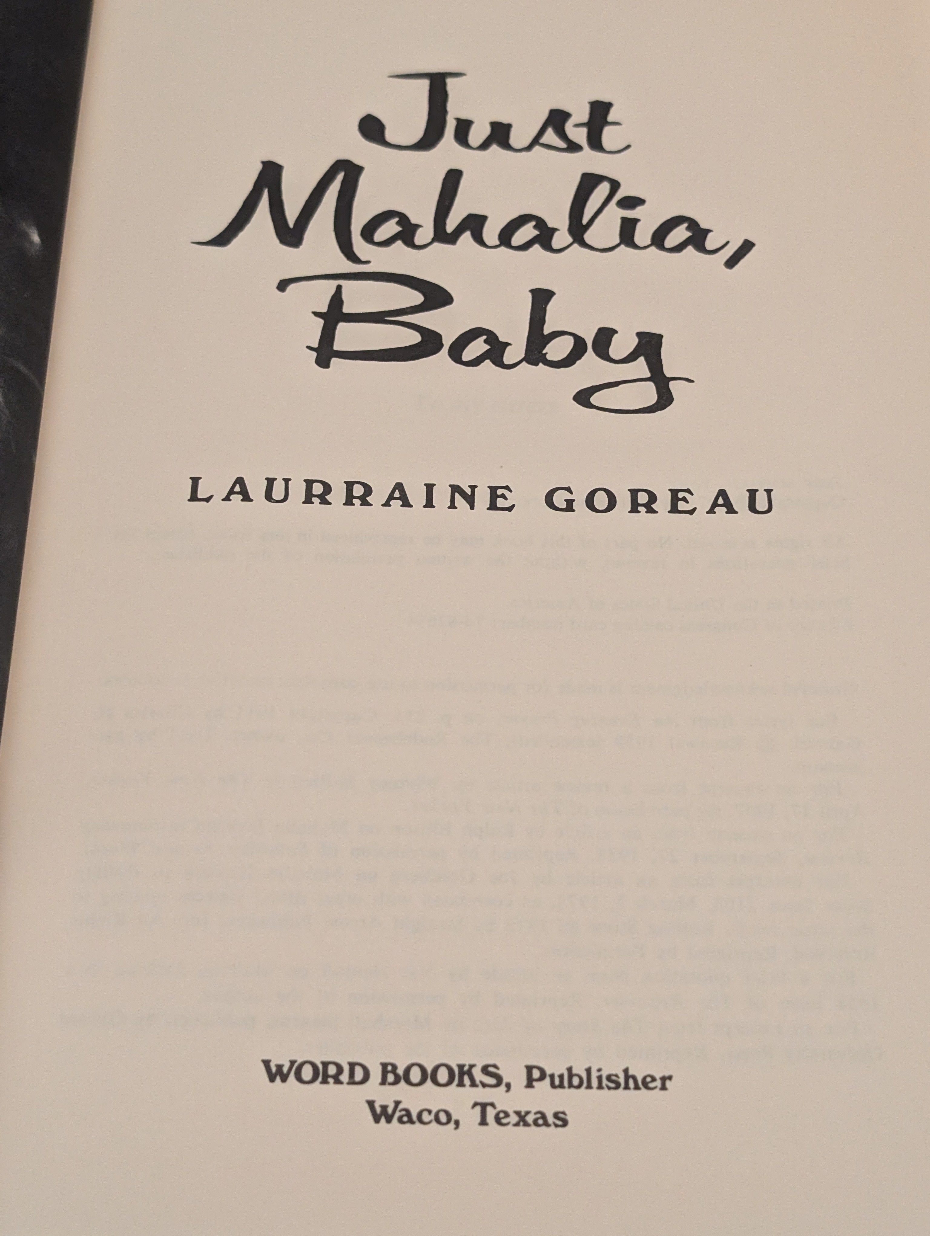 Dust jacket notes: "Here is 'the real book' of the incredible Mahalia Jackson, as pledge to her by her close friend, Laurraine Goreau, before her death. Rich in poetic condensation and vivid imagery, it reaches back to recreate an era and a way of life that no longer exist; it surfaces hidden folk lore and cultural patterns; it delves into Voodoo and a secret psychic world. It shows you jazz at it roots when it was 'jass,' the Devil's temptation; first-hand, it gives you the surprising sociological significances of the whole gospel movement...but most of all, it takes you with a misshapen mote on a forgotten scrap of river-land as Mahalia pushes, fights, sings her way to a personage of unique stature among Americans to the world's peoples, revered by hundreds of thousands as a symbol of utter integrity, the bearer of God's tidings. She sang with literal faith in the path of salvation - yet waged a hidden struggle for health and elusive happiness as Halie, 'famous through disappointments.' Walk with her as a strong, quiet force in the early civil rights struggle, an ardent ally of Dr. Martin Luther King, Jr. Sit with her with the Empress of Japan. Search with her for God's intention and her temple. Swift-paced as a novel, the tale is told with absolute authenticity - the result of wholly fresh, careful, skilled research and a singular rapport which made the gathering possible, the language caught by cassette tape. Miss Goreau exercises a technical skill which enables the reader to move in and out of the minds of various characters as they add their threads to her intricate weaving of the life of one of the great, rare spirits of our time."