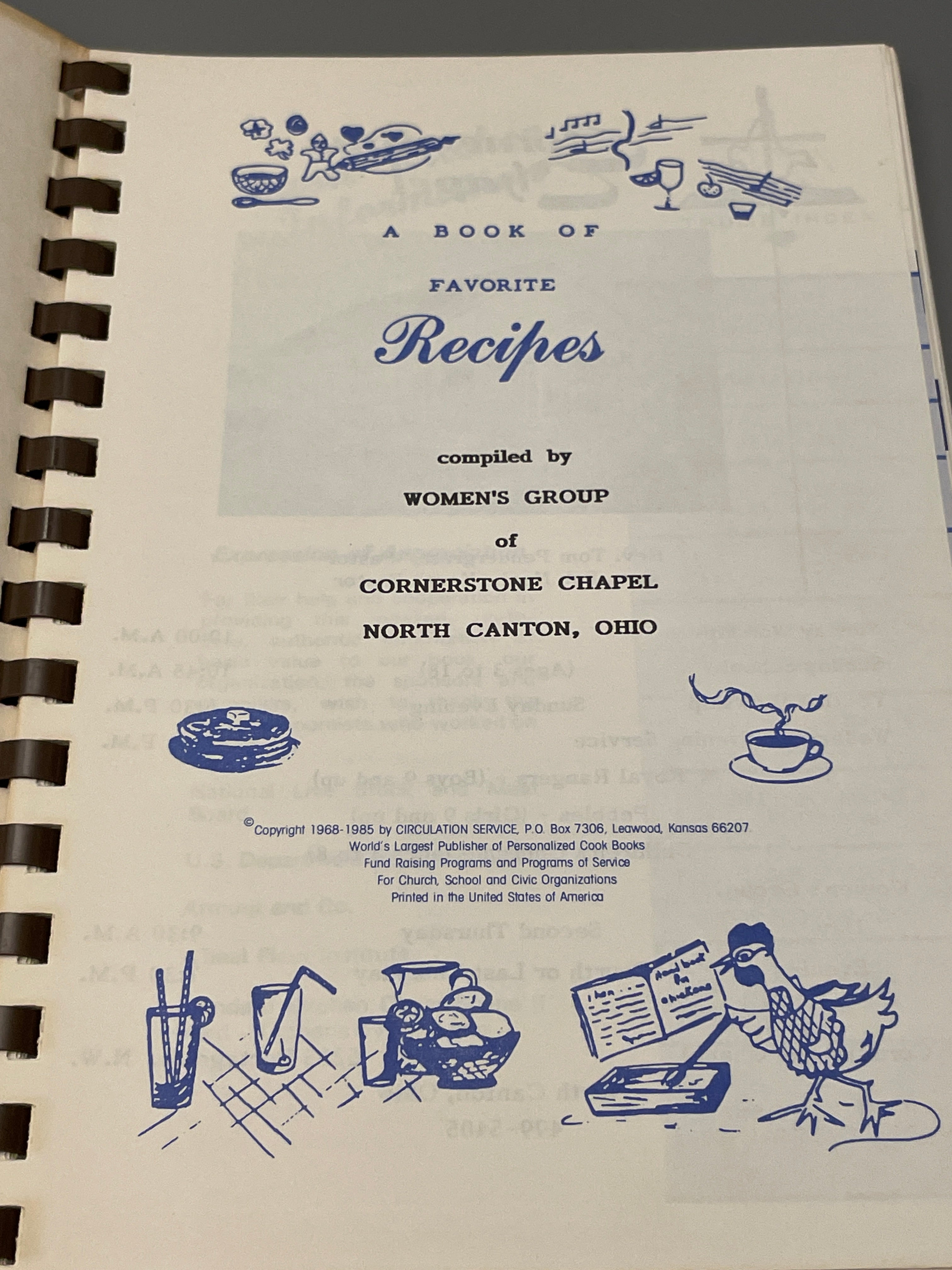 A Book of Favorite Recipes compiled by Women's Group of Cornerstone Chapel, North Canton, Ohio is backordered and will ship as soon as it is back in stock.