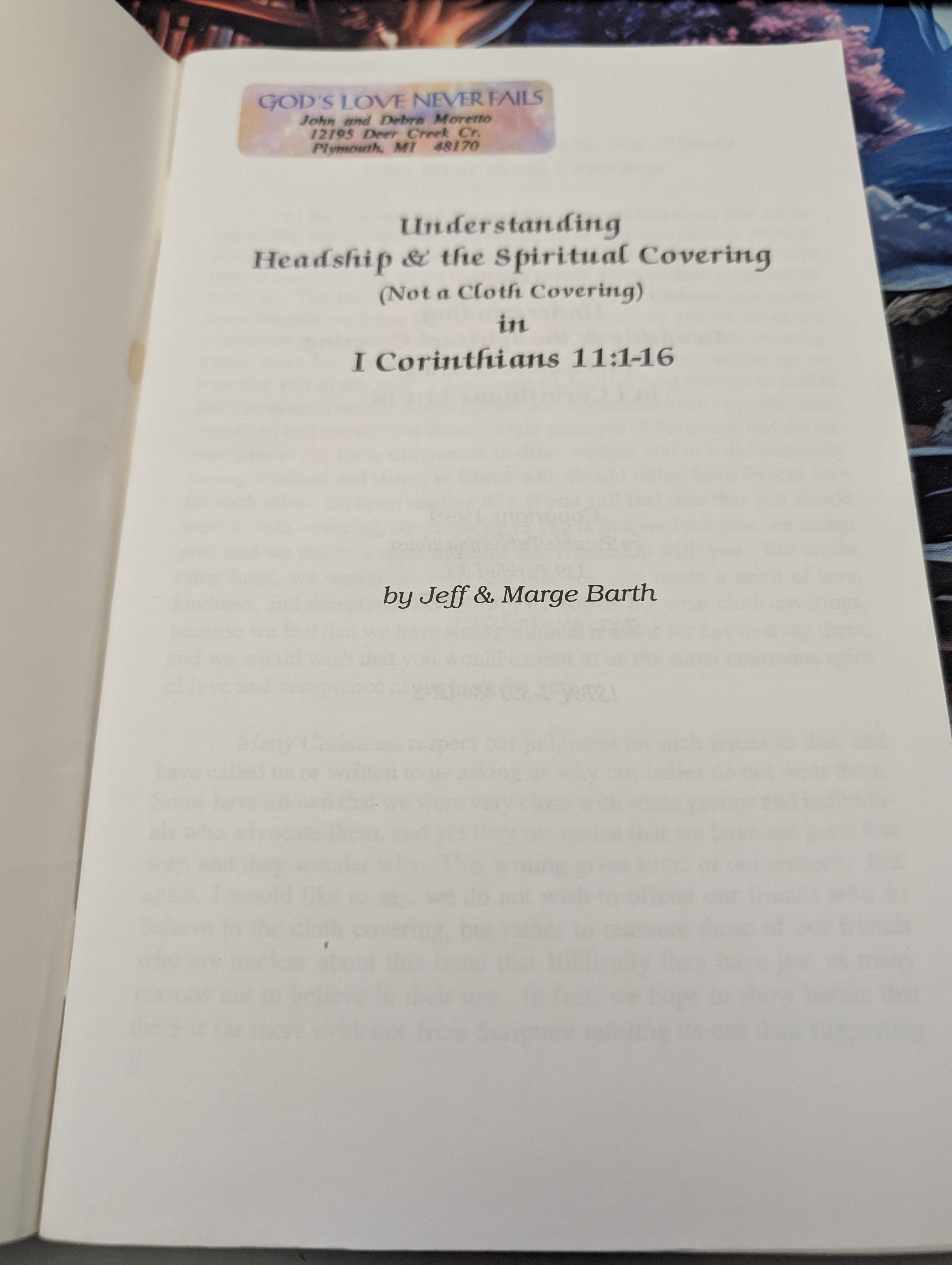 Understanding Headship & the Spiritual Covering (Not a Cloth Covering) in I Corinthians 11:1-16 by Jeff & Marge Barth is backordered and will ship as soon as it is back in stock.