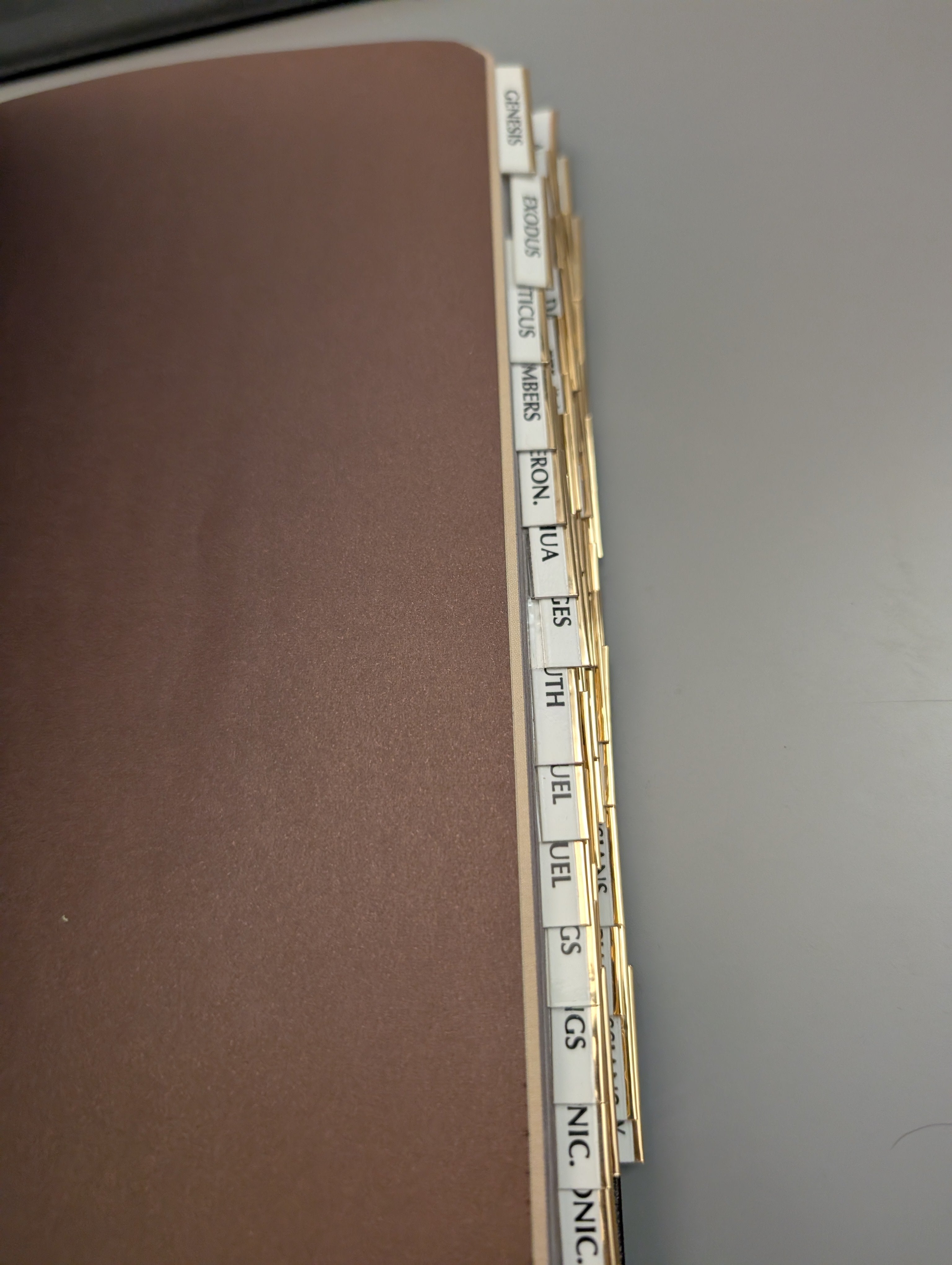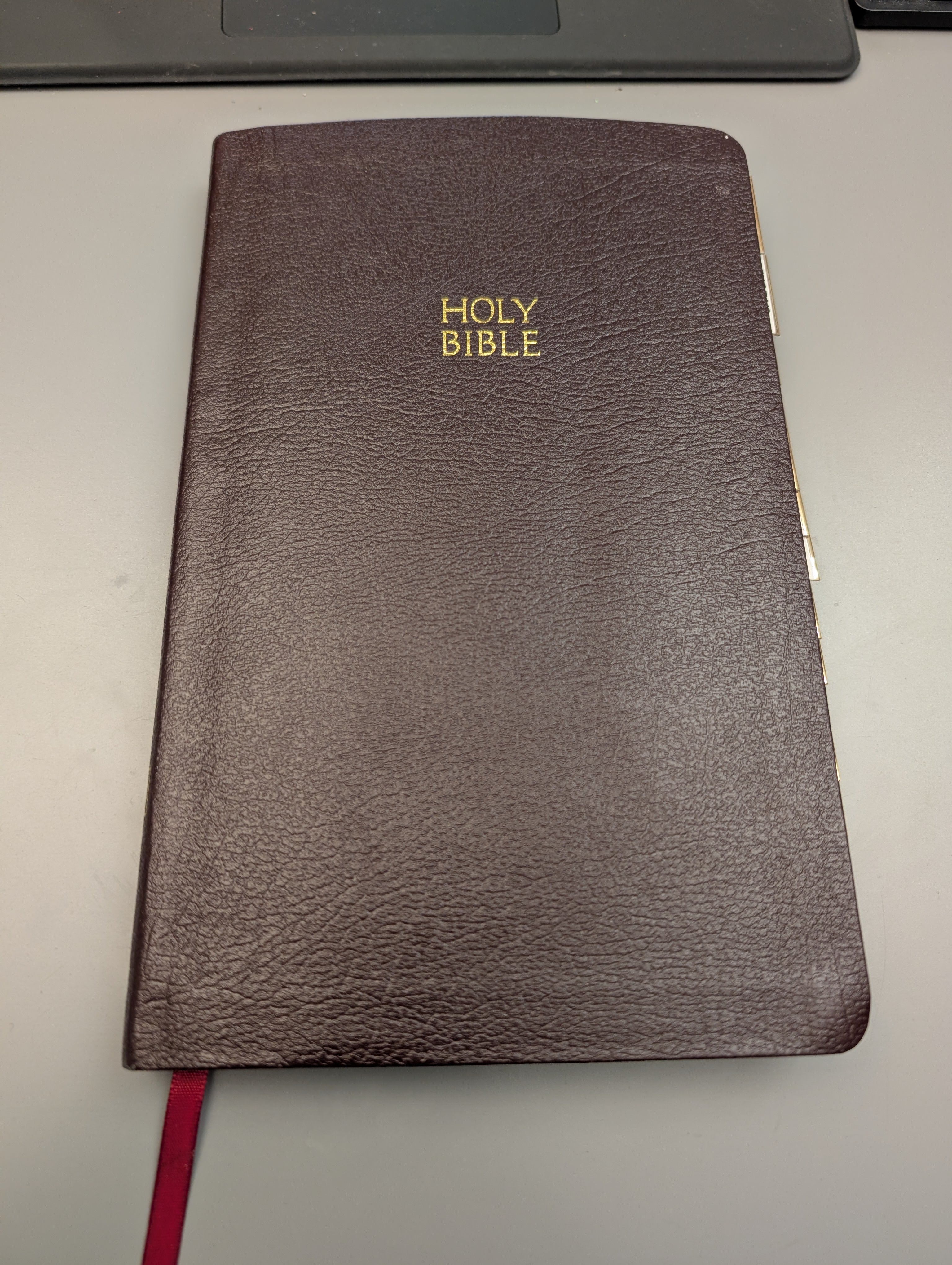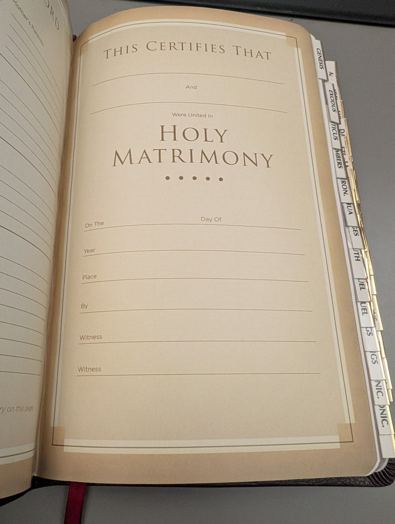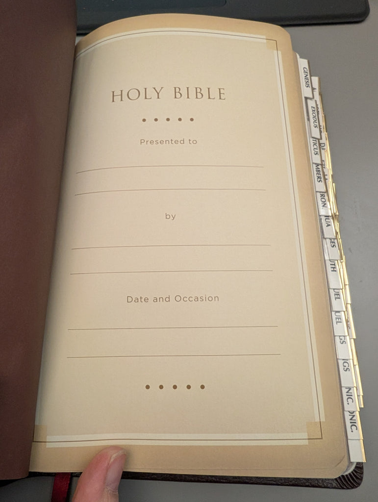 Bible in Very Good condition with tabs. Ribbon bookmark. Inscription pages are unused. Gilt edged pages. See pics.