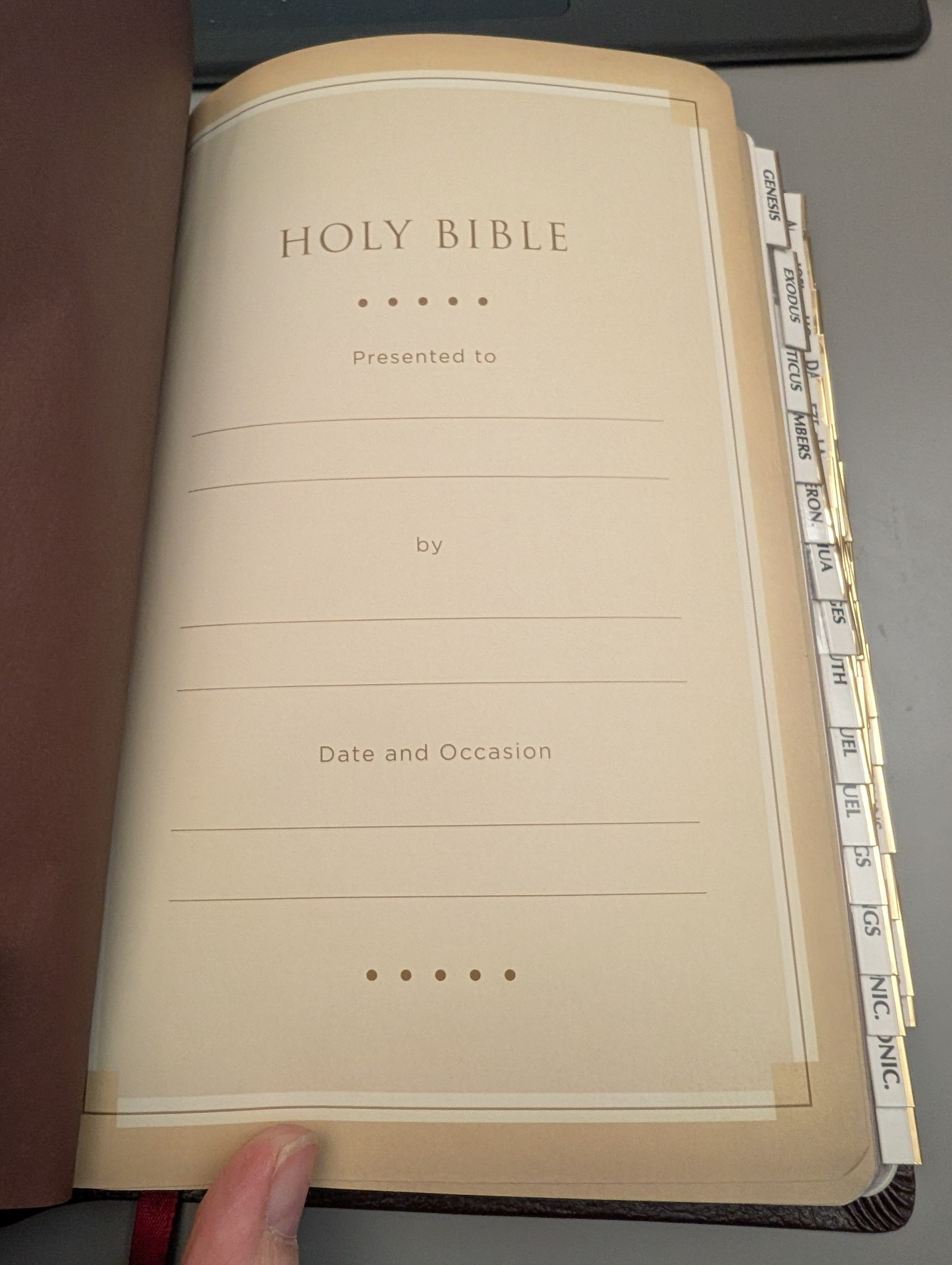 Condition Details: Bible in Very Good condition with tabs. Ribbon bookmark. Inscription pages are unused. Gilt edged pages. See pics.