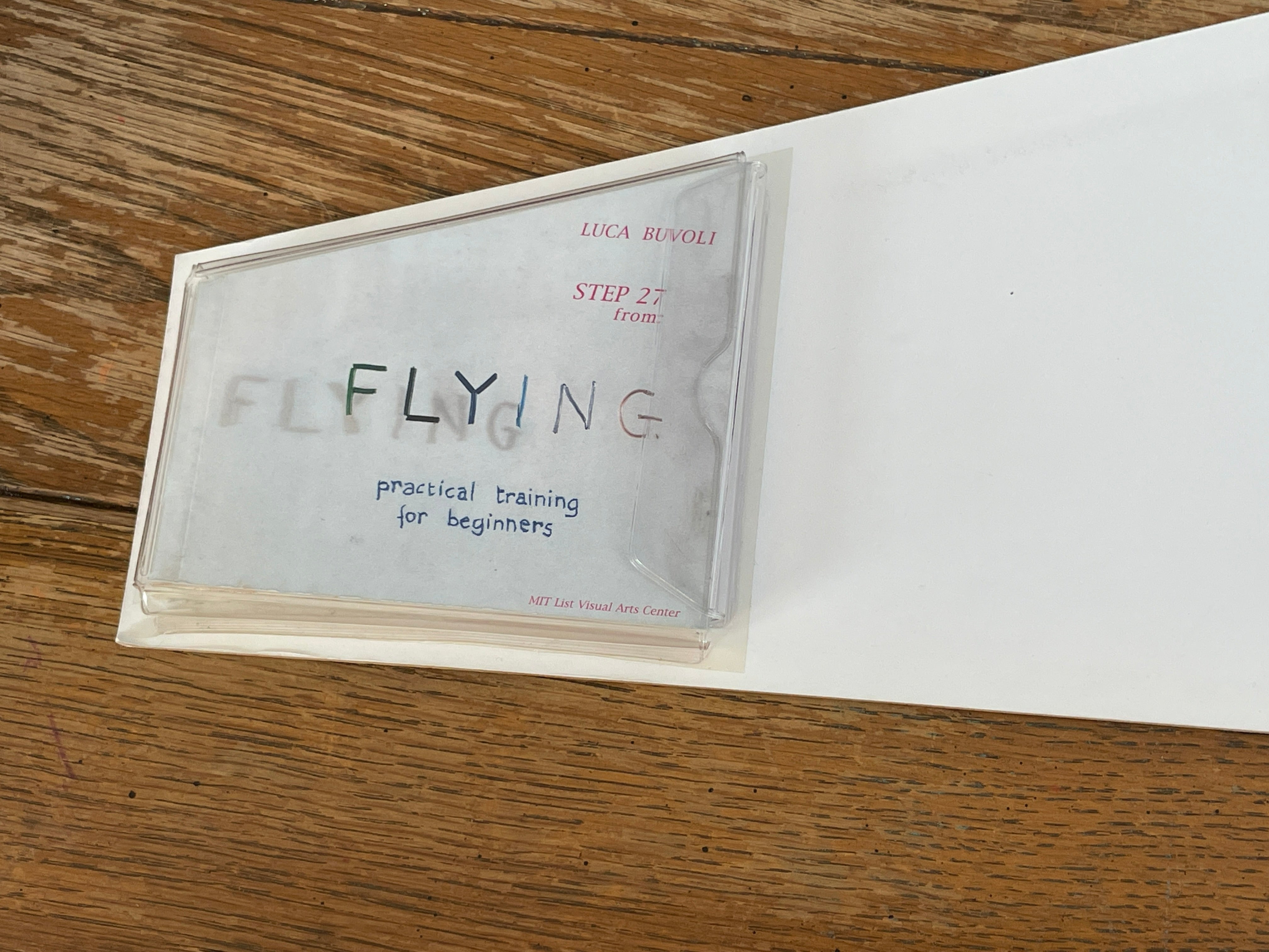 Flying: Practical Training for Beginners, an artist's book by Luca Buvoli, documents his film of the same name and is one component of Buvoli's solo exhibition at the List Visual Arts Center at MIT in Spring 2000. Trapezoidal in shape, like the wing of an airplane, Flying contains two separate books under one cover: an "instruction manual" containing the film script, diagrams, animation cells, maquettes, and notes, and a smaller flipbook reproducing the final sequence of the film. Buvoli, whose artist books are avidly collected, has created a colorful, surreal film that presents the "33-Step Method" developed by the fictional professor M.a.S. to satisfy one of humanity's most ancient dreams, namely flying. Professor M.a.S. lectures at a darkened classroom using diagrams, animated films, and scientific commentary to instruct his audience on a series of movements which, when performed correctly, allow one to fly without the help of any mechanical device. Buvoli's work has been shown extensively in his native Italy and will also be familiar to American audiences from his exhibitions at the New Museum in New York, the Santa Moncia Museum of Art, and the Cleveland Center for the Arts.