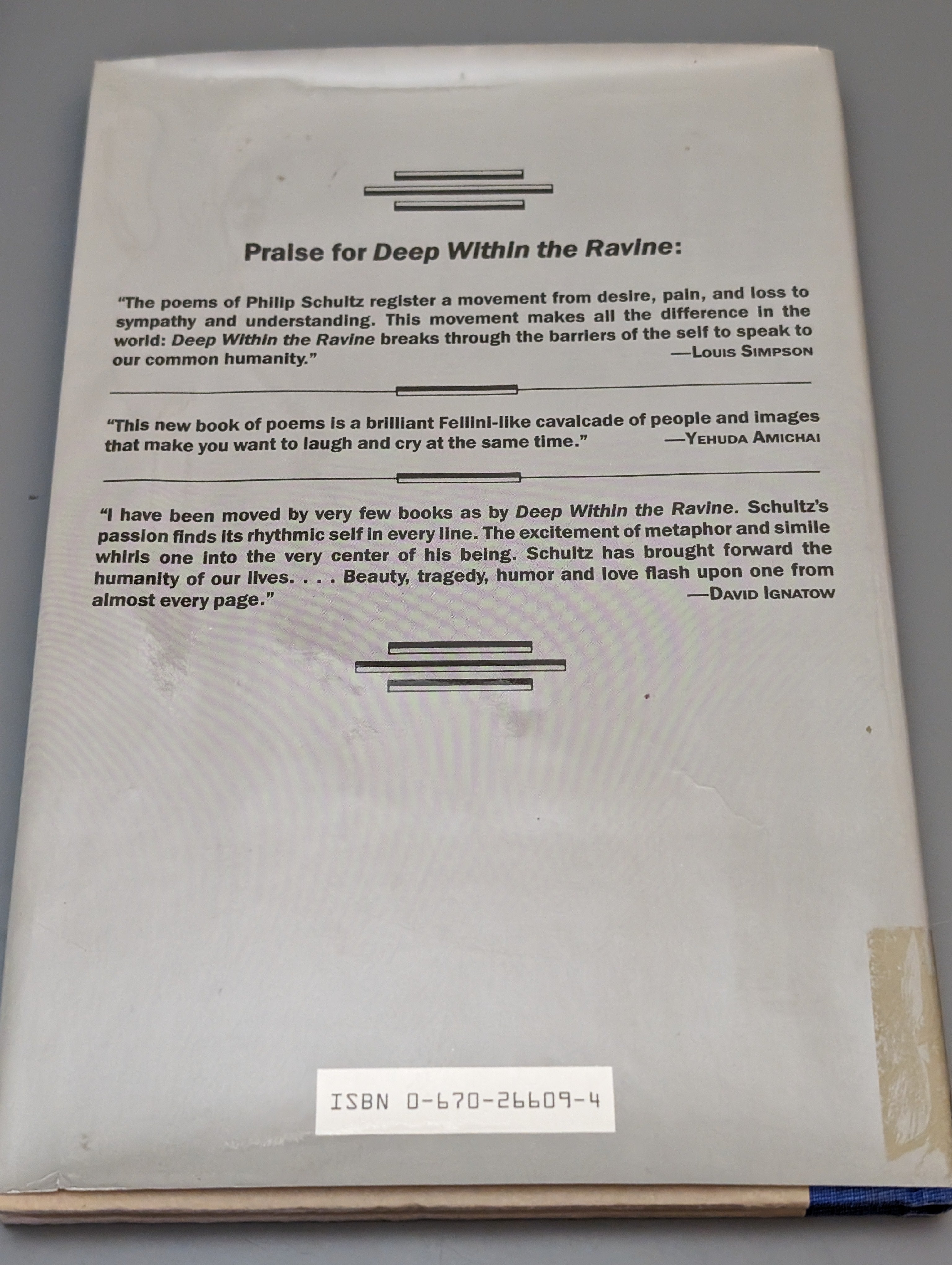 Deep within the Ravine: Poems by Schultz, Philip 1984 Ex-library SEE PICS is backordered and will ship as soon as it is back in stock.