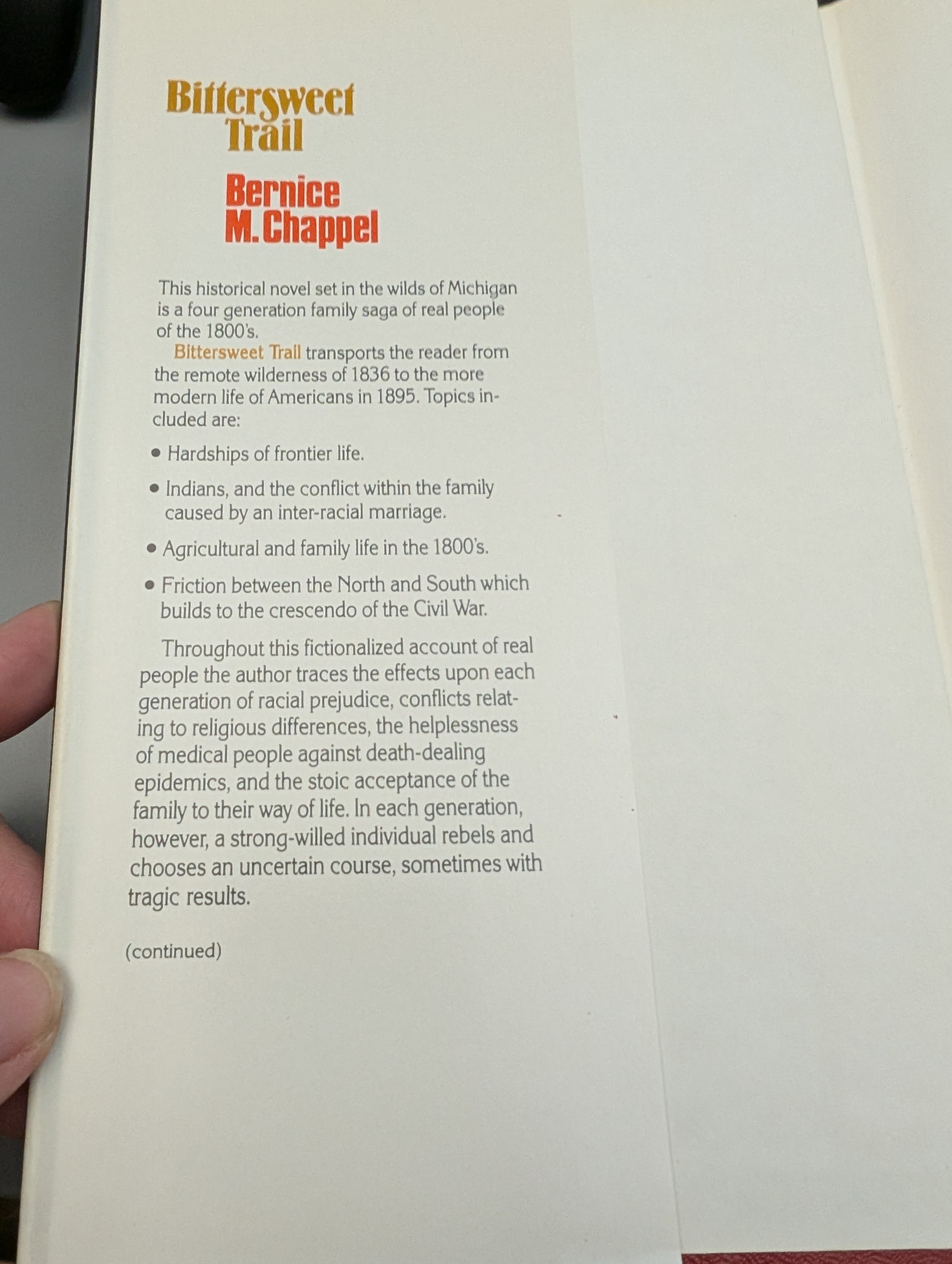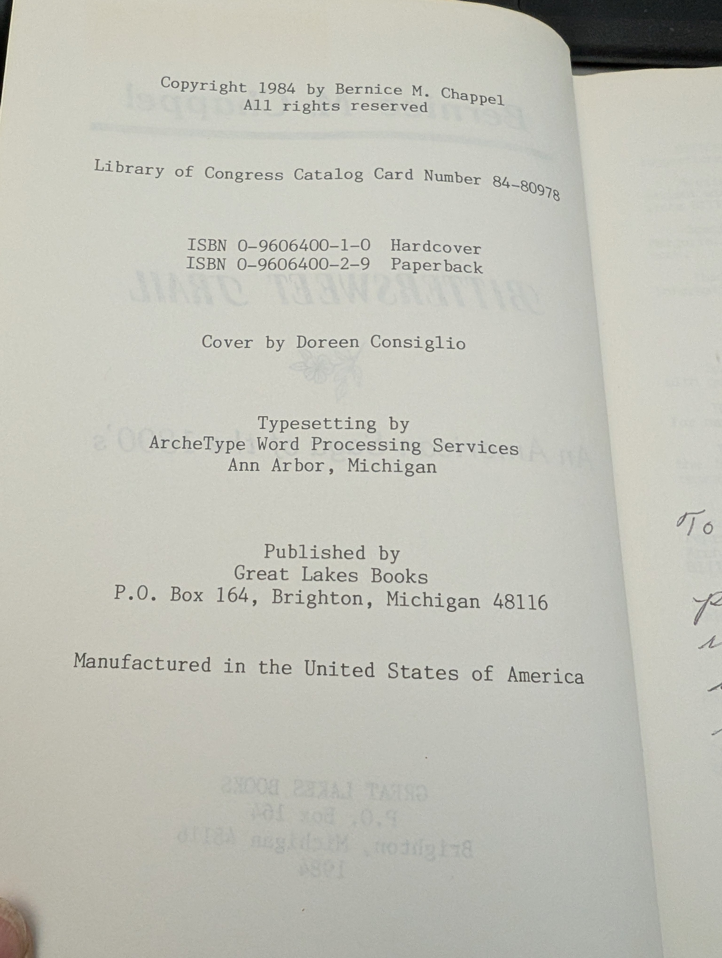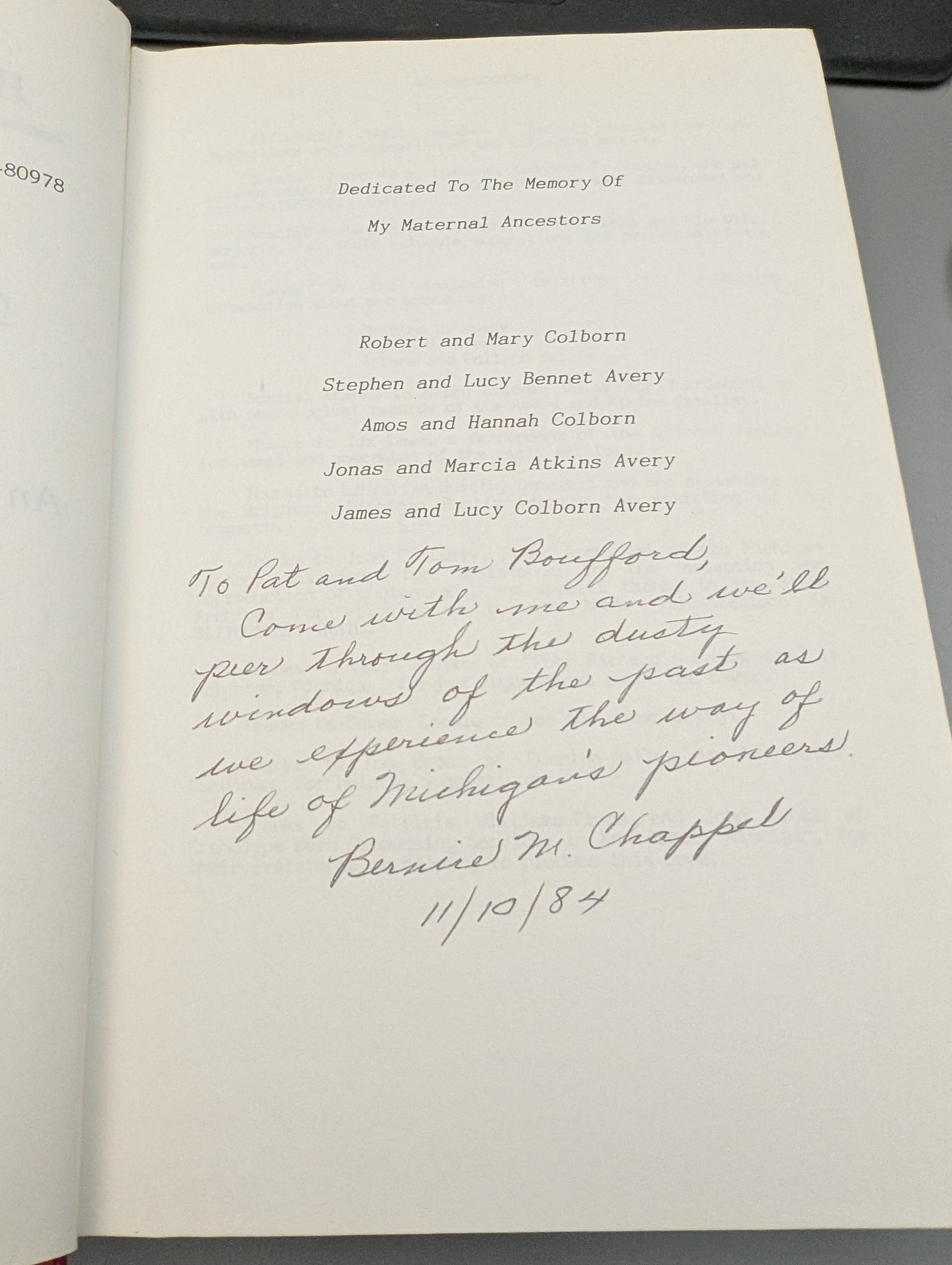 "To Pat and Tom Boufford, Come with me and we'll peer through the dusty windows of the past as we experience the way of life of Michigan's pioneers. Bernice M. Chappel 11/10/84"