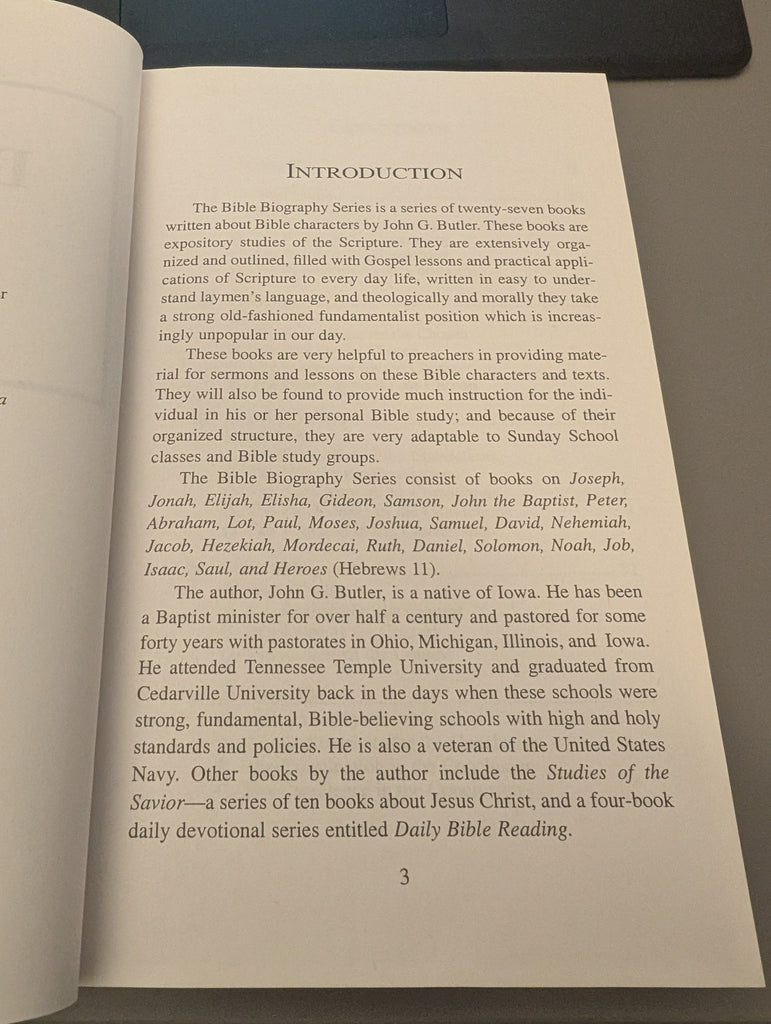 From the experiences of Bible characters can be learned many helpful lessons in matters of faith, godly conduct, and Christian service. God could have given the Scriptures to us only in the form of a rule book. But instead He wisely included in the Scriptures instructive and exciting biographies of flesh and blood people to whom we can easily relate. The Bible Biography Series is a study of twenty-seven prominent Bible characters whose lives provide us with much important truth for every person, age, and culture. These books are expository studies of the Scripture which allow the Scripture to determine the subject matter and lessons. They are also extensively outlined to organize and clarify the study. While the books, because they are biographical, emphasize the practical truths of the text, they also teach much doctrine where that is part of the text of study. John Butler was born and raised in a small farming community in north central Iowa. He is a veteran of the U.S. Navy, attended Tennessee Temple College and graduated from Cedarville College. He has been preaching for over 45 years with 35 years in the pastorate. He held four pastorates, one each in Williamsburg, Ohio; Detroit, Michigan; Chicago, Illinois; and Clinton, Iowa. He is the author of the 27-volume Bible Biography Series, the 10- volume Study of the Savior Series, and the Analytical Bible Expositor, a 14-volume set. The author was married to his wife for over 40 years (he is now a widower), has three children and five grandchildren.