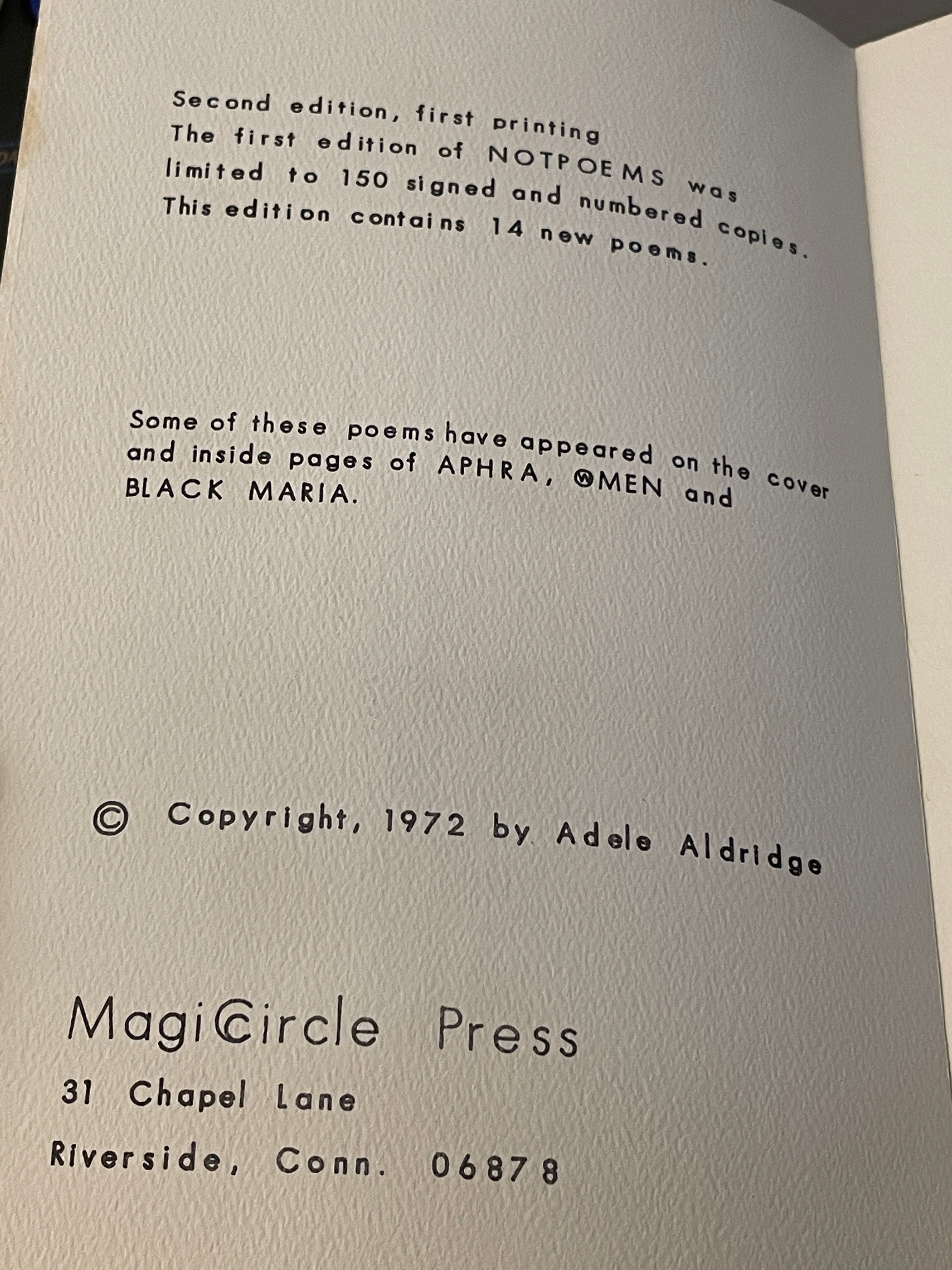 NOTPOEMS by Adele Aldridge (1972) SECOND EDITION is backordered and will ship as soon as it is back in stock.