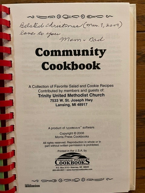 Trinity United Methodist Church: Community Salad Luncheon Cookbook is backordered and will ship as soon as it is back in stock.